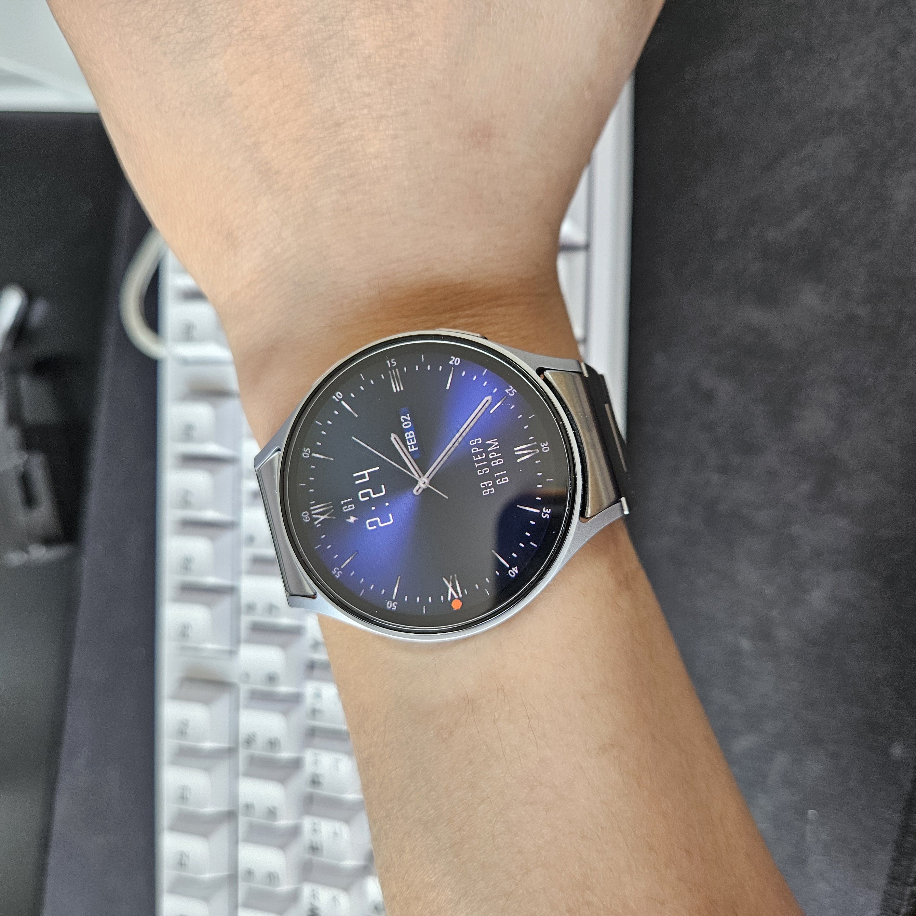 갤럭시워치7은 줄 바꾸는 것도 애플워치처럼 쉽게 바뀌었어요. 버튼형이라서 옛날처럼 막 손톱 아파가면서 교체 안해도 된다는 점! 그래서 저는 평소에 이렇게 메탈처럼 하고 다니고 운동하거나 할 때는 고무로 바꿔가면서 사용하고 있습니다. 그래도 배경화면은 바꾸지 않지만요 ㅎㅎ...