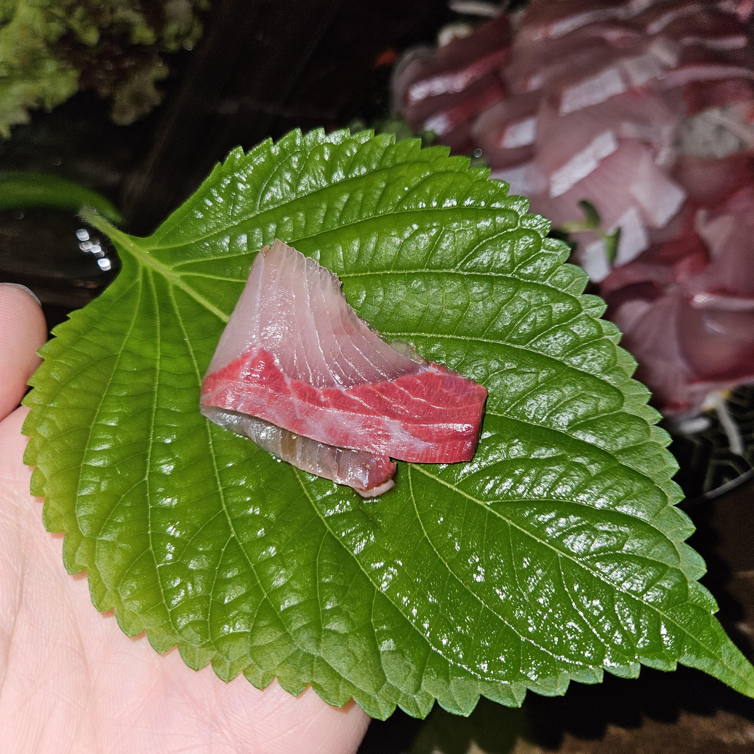 불끄고 후레쉬 터뜨려서 찍은 방어 사진! ㅎㅎ 붉은 빛이 도는게 아주 맛있었다. 특히 엄청 신선했다. 비린내가 하나도 안났고 회의 색감이 아주 뚜렷했다. 그리고 무엇보다 탱글탱글한 식감이 일품이었다.