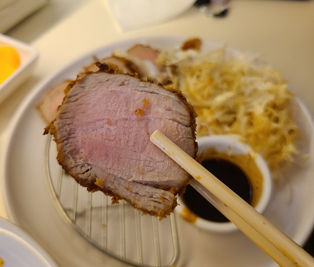 돈까스.. 아니 뭐 히레카츠도 맛있었다. 돈까스라고 하기에는 모양새나 맛이나 고퀄이라 히레카츠라고 말해야겠다. 튀김옷은 적당한 바삭함에 얇아서 좋았다. 안심은 딱 부드러운 정도의 굽기여서 입맛에 딱 좋았다. 양념 소스에 푹 찍어서 반찬들과 함께 먹으면 속이 든든하다.