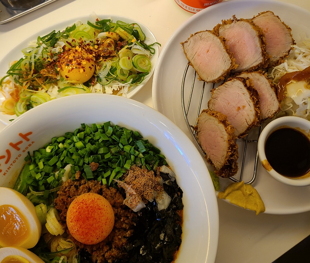 매운 마제소바인 '카라이 마제소바'와 히레카츠(안심)을 시켜서 먹었다. 맵다고 하는데 우리가 보통 정도를 선택해서 그렇게 맵지는 않았다. 매콤한게 뿌려져 있다는 느낌이 드는 정도. 그리고 파&계란 추가 ㅎㅎ 반찬삼아 먹기에 매우 훌륭한 음식이었다.