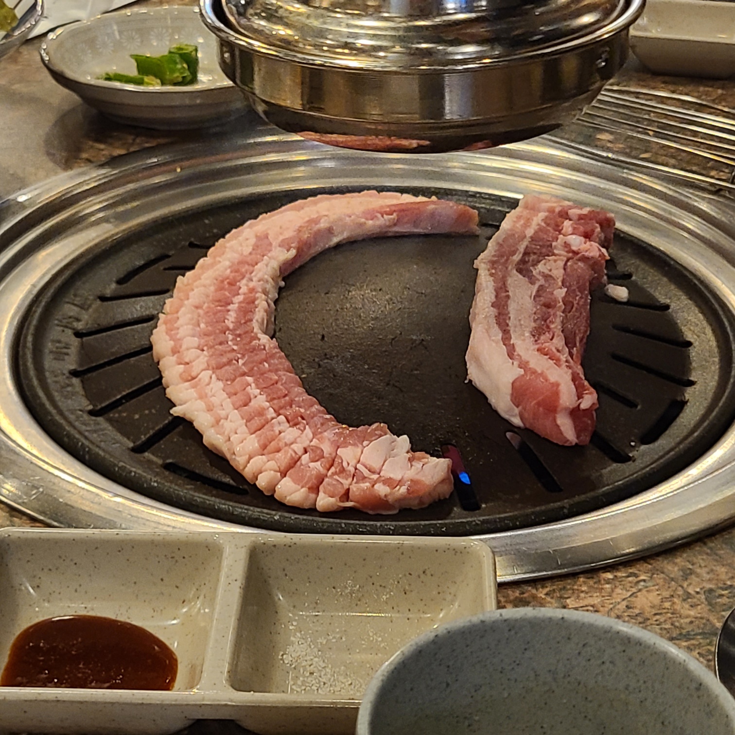 자세히 보면 살짝 밑간이 되어 있는 것 같았다. 요즘 느끼는 거지만 고기는 밑간이 엄청 중요한 것 같다. 따로 뭘 찍어 먹지 않아도 맛있어 지는 마법! 고기는 가만히 놔두면 불판이 달아 올랐을 때 구워주신다.