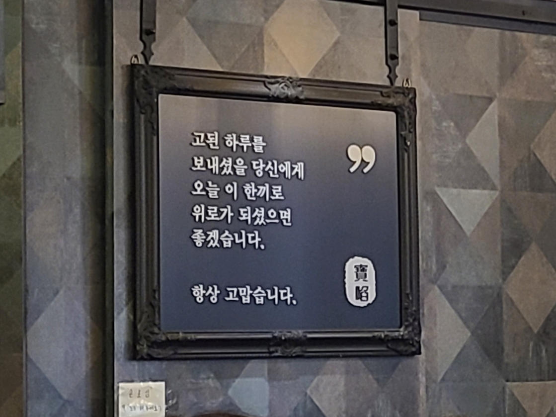 메뉴판 찼다가 봤는데 좀 찡했다. 퇴근하고 오면 이거 보고 울었을 듯.. 요즘 스트레스 수치가 너무 높아서 그런가 ㅠㅠ 근데 고기가 맛있으면 위로를 넘어서 에너지가 될 듯!
