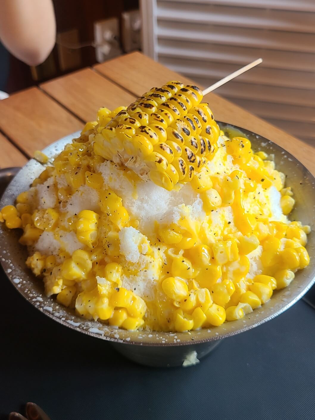 조금 기다리자 나온 초당 옥수수 빙수! 옥수수가 진짜 시원했다 ㅋㅋ 얼음 위에 있어서 당연히 그렇겠지만 cold 말고 뭐랄까 상큼한 시원함이었다. 옥수수 식감이 사각사각 재밌었다. 날씨가 점점 더 더워지니까 앞으로 빙수가 더 땡길 것 같다. 진짜 옥수수다 보니 과하게 달지 않아서 더 상쾌하고 좋았다.