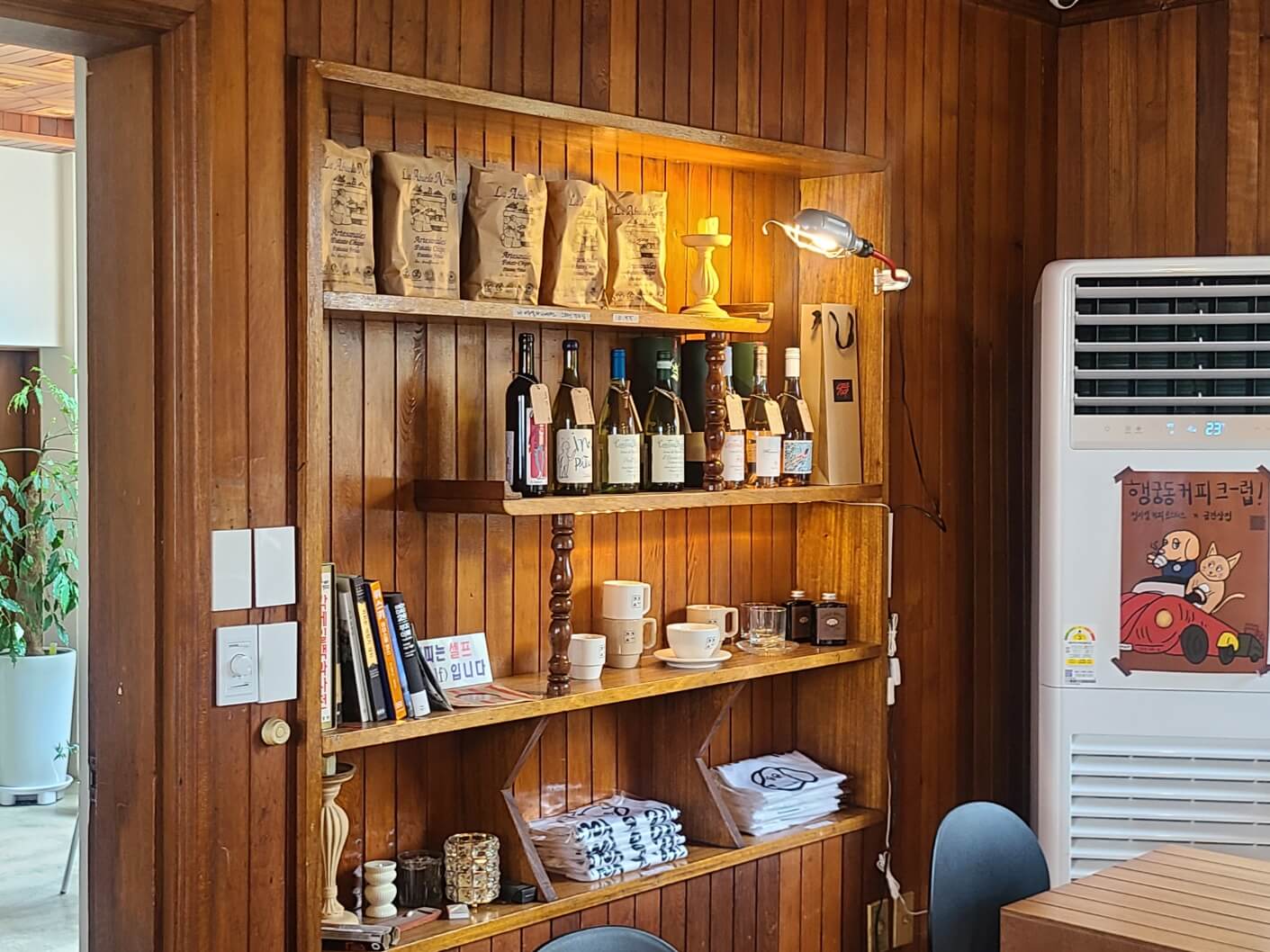 카페 내부는 내가 좋아하는 분위기였다. 원목 인테리어가 깔끔했고 홈조명이 소품들을 더 돋보이게 했다. 소품 중에는 위스키었나? 와인이었나?