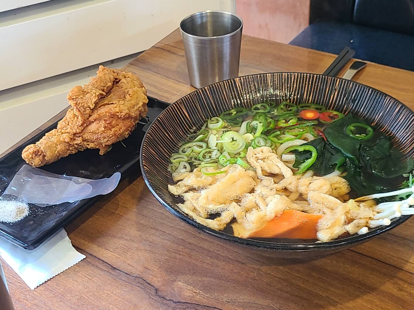 조금 일찍 먹는 식사기도 하고 난 밥 먹고 축구하러 갔어야 해서 우동 하나에 닭다리 하나를 주문했다. 우동은 면발이 탱글탱글하고 두툼한게 내가 좋아하는 식감이 있다. 쫄깃하면서 살짝 쫀득한 그 식감~ 그리고 닭다리가 진짜 예상치 못하게 맛있었다. 진짜 튀김 껍질부터 미쳤음. 저건 그냥 사이드로 꼭 하나 시켜봤으면 하는 메뉴다. 양이 많을 것 같은데? 나중에 치킨 먹지 뭐~ 이런 생각 접어두고 하나만 제발...!!
