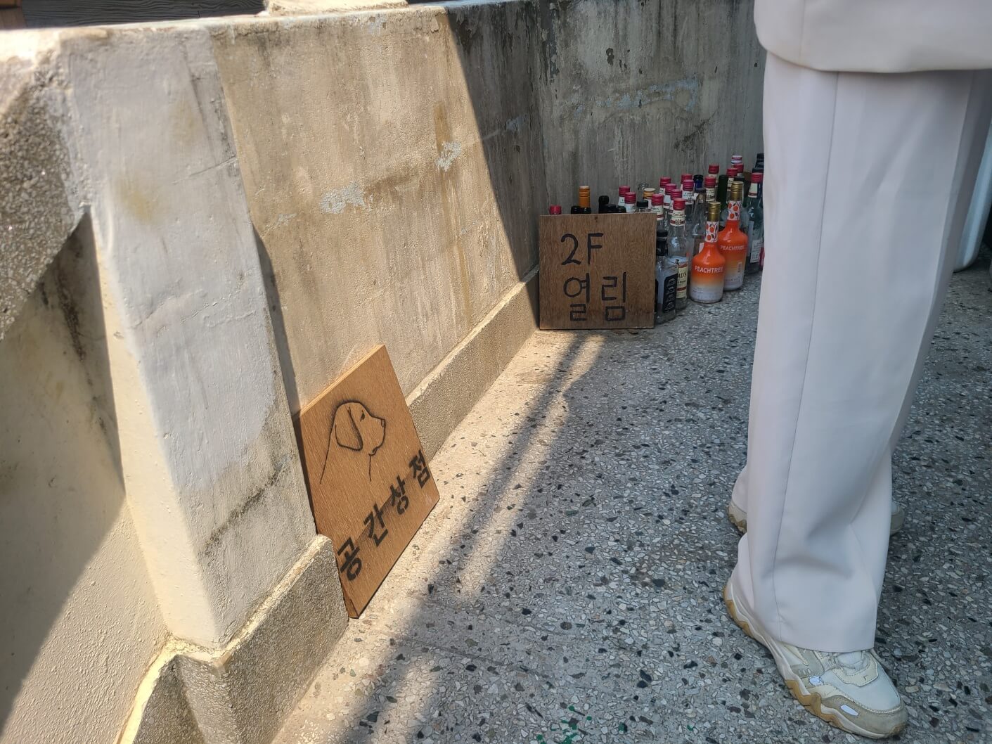 옛날 빌라의 형태를 잘 유지하고 있는 이 곳의 특색에 맞게 오픈형 계단을 올라가면 된다. 왼쪽에 나무 판자에 강아지 그림에서 힌트를 얻을 수 있는데, 카페에는 큰 개(?)가 있다. 내 기준에 덩치가 크면 개다...