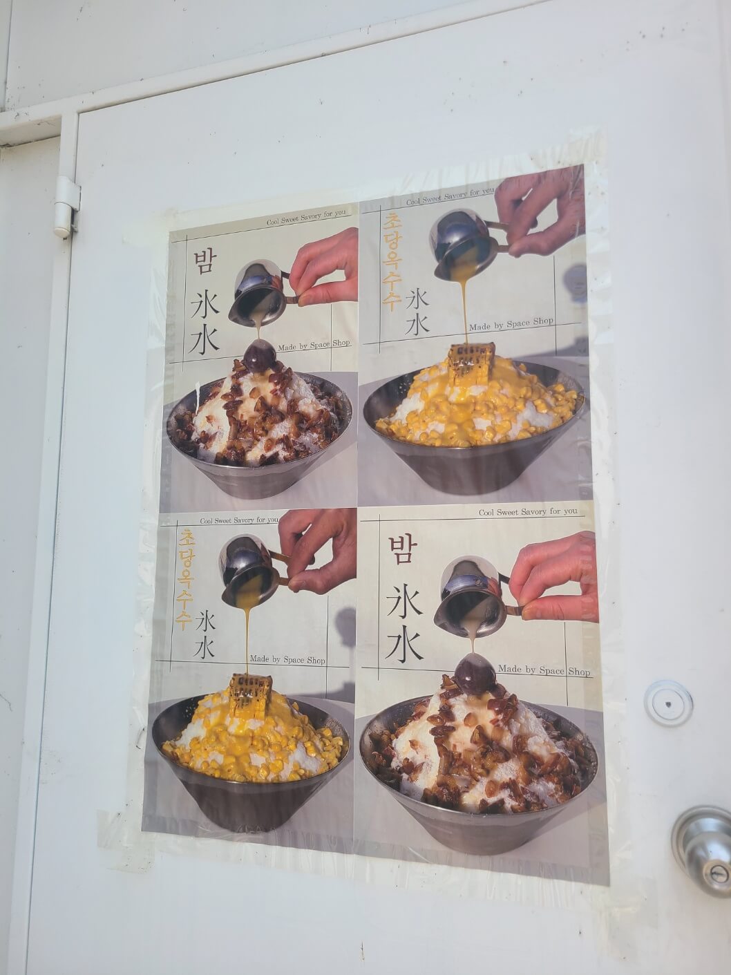 1층에 있는 운멜로에서 밥을 먹고 2층 카페로 바로 가는 사람들도 있을 듯 하다. 우리가 공간상점이라는 카페에 관심을 가지게 된 것은 바로 이 포스터! 밤 빙수와 초당 옥수수 빙수가 있었다. 산책할 겸 걷다가 이 포스터를 봤고, 좀 더 걷다가 이 카페에 가기로 해서 다시 찾았다.