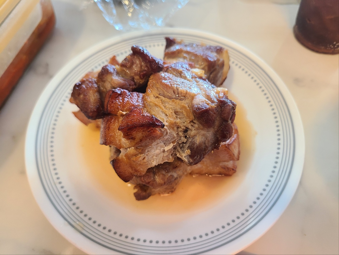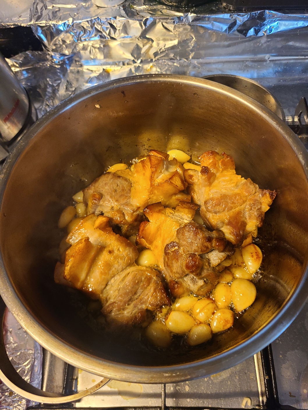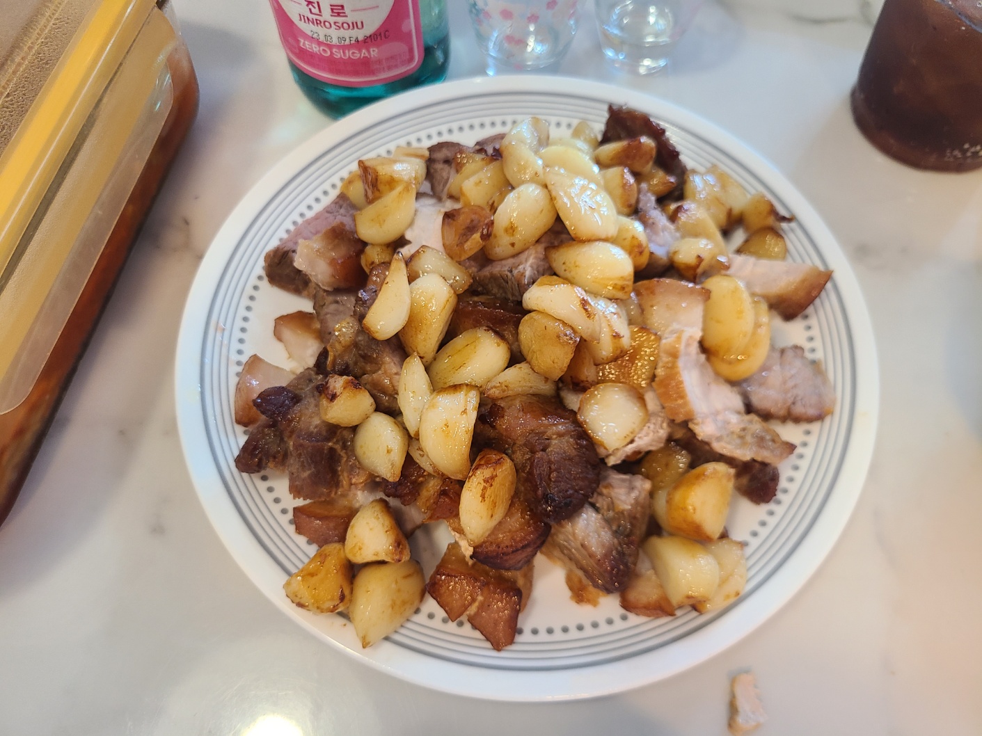 6면 모두 잘 익고 마늘도 말랑말랑 잘 익었다면 슬슬 꺼내주자. 튀김수육 느낌이기 때문에 속이 잘 익어야한다. 그래서 뚜껑을 꼭 잘 덮어야 하는 것!