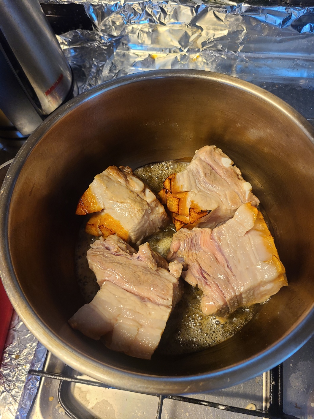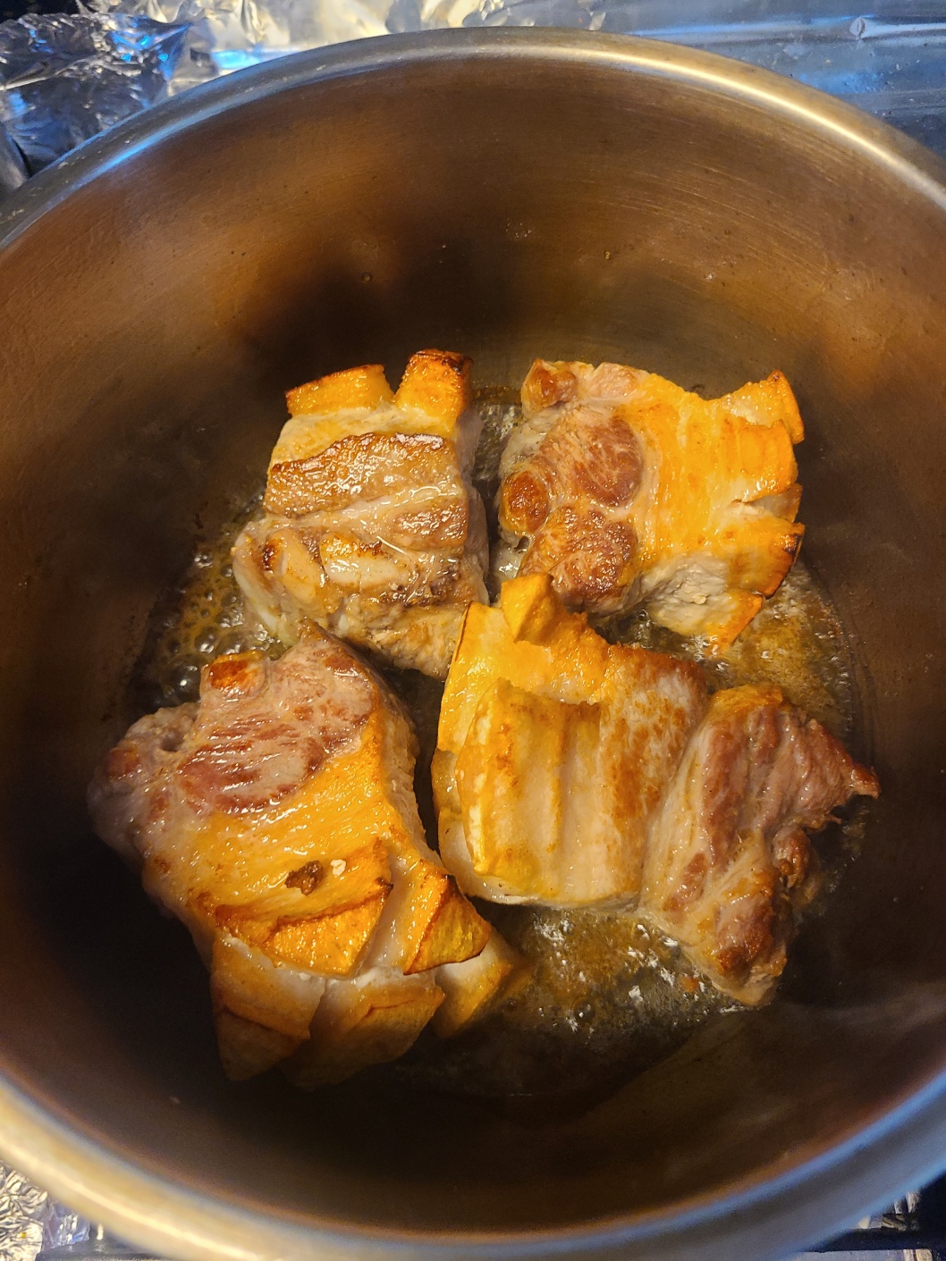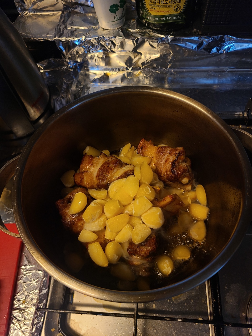 6면 모두 잘 익고 마늘도 말랑말랑 잘 익었다면 슬슬 꺼내주자. 튀김수육 느낌이기 때문에 속이 잘 익어야한다. 그래서 뚜껑을 꼭 잘 덮어야 하는 것!