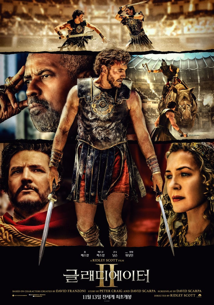 이제 글래디에이터2에 대해 이야기해볼게요! 이번 영화는 막시무스의 죽음 이후 20년이 흐른 시점을 배경으로 하고 있어요. 쌍둥이 황제 게타와 카라칼라의 폭압 아래에서 새로운 주인공이 등장하게 되는데, 이 인물은 막시무스의 유산을 이어받아 싸우는 전사입니다. 사실 1을 안보고 봐도 영화를 즐기는데 큰 무리는 없습니다.