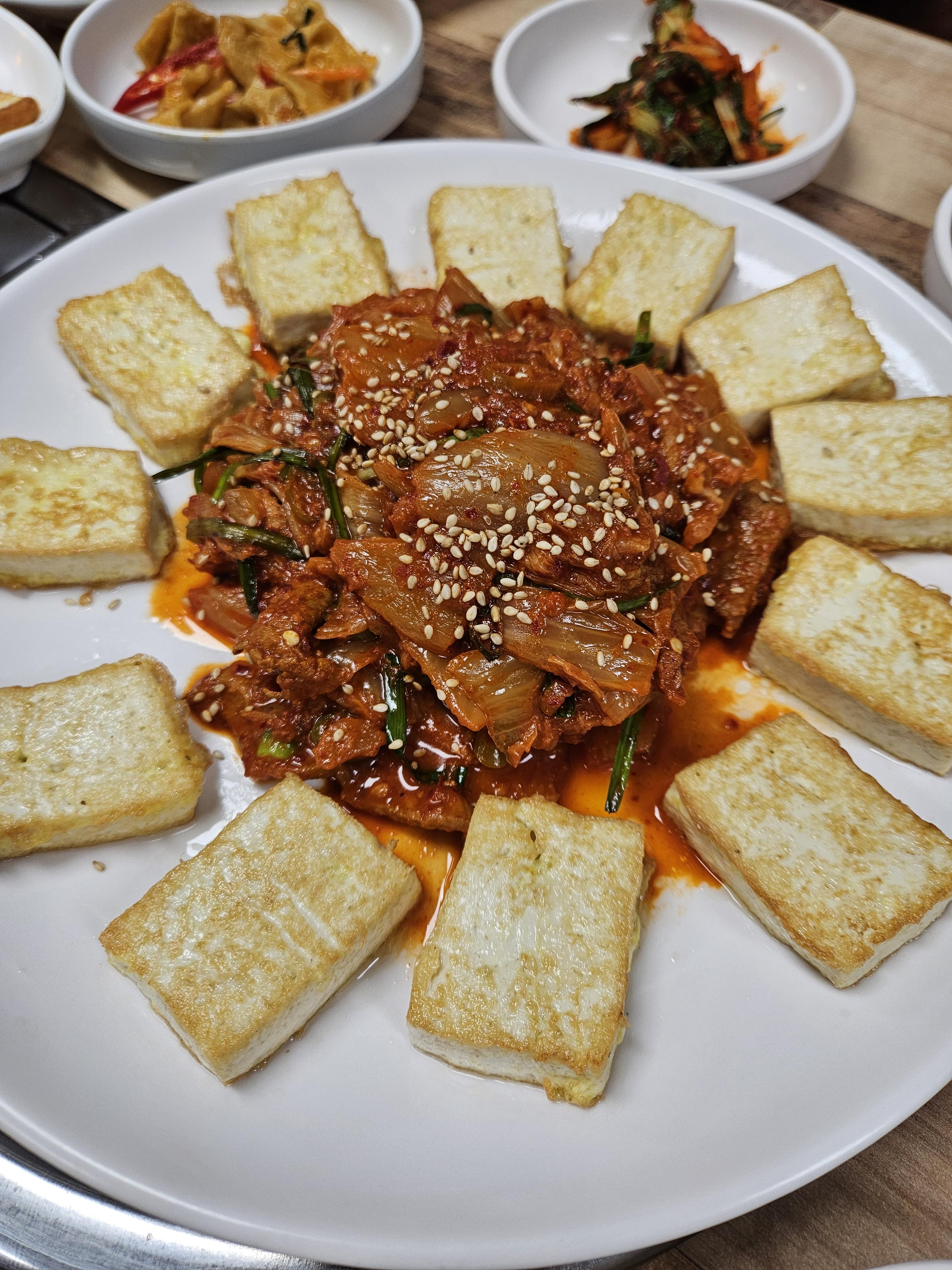 지각생 중 1명이 먼저 도착해서 안주를 시켰다. 그리고 바로 술 들이부었다. 일단 먼저 두부김치 먼저! 들기름에 구운거라서 때깔과 맛 자체가 다르다. 진짜 들기름에 구웠다길래 안주 선택 바로 질러버림. 잘 익은 김치랑 고기는 진짜 말해뭐하니. 말할 시간에 하나라더 더 먹었다. 최근 먹은 두부김치 중에 최고로 맛있음. 거짓말 안하고 웬만한 한정식 집에서 나오는 것 보다 더 맛있다고 느껴질 정도니까 꼭 시켜 먹어보길 바란다.