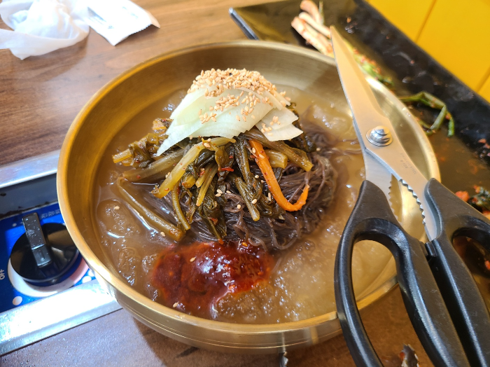 열무김치 냉면을 시켰다. 물냉+비냉의 느낌이고 열무김치가 들어가니까 맛이 새로웠다. 물냉면 국물을 들이키는 걸 좋아하는데 양념이 있어서 살짝 힘겨운 건 좀 아쉬웠다. 냉면 특유의 시원한 맛은 충분하니 고기랑 같이 먹도록 하자.