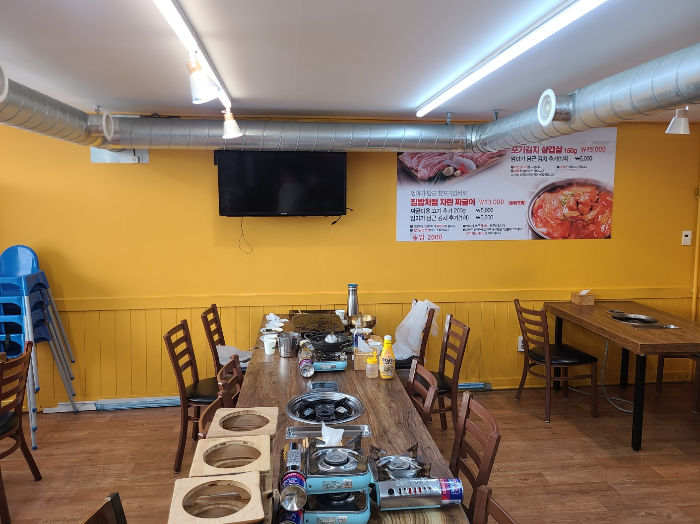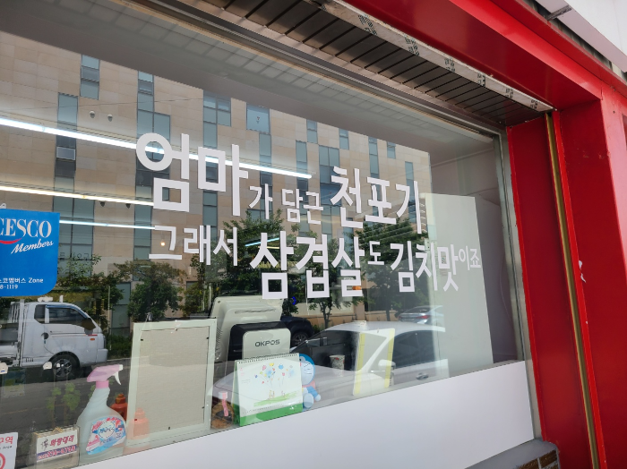 간판도 깔끔하고 새것 같다. 태극기 색깔 따다가 만든 것 같았다 ㅋㅋ 쨍하고 채도 높은 컬러를 잘 쓴 느낌이었다. 창문에는 가게의 특징과 자랑하고 싶은 얘기를 가득 써놓으셨다. 엄마가 담근 천포기 김치가 나온다는 말에 홀려서 가버렸다. 직접 담근 김치는 피할 수 없지.