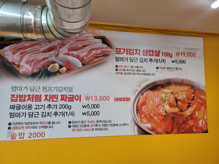 짜글이도 정말 궁금하긴 했는데 삼겹살이 땡겨서 포기김치 삼겹살 2인분을 시켰다. 150g에 15,000원이면 괜찮은 가성비인듯? 심지어 이게 가격이 오른 것 같은데 스티커 붙어있는 거 보니까! 재방문 할 의사가 있는데 그때는 짜글이를 먹어보기로 했다.