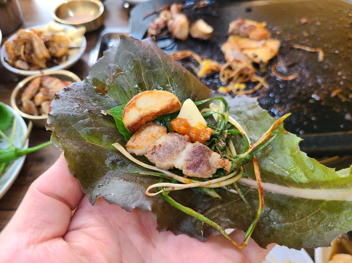 여러 종류의 쌈에다가 반찬 한가득 넣고 와구와구 먹었다. 쌈이 다양하고 싱싱해서 정말 좋았던 청주 삼겹살 맛집, 청남삼겹살이었다.