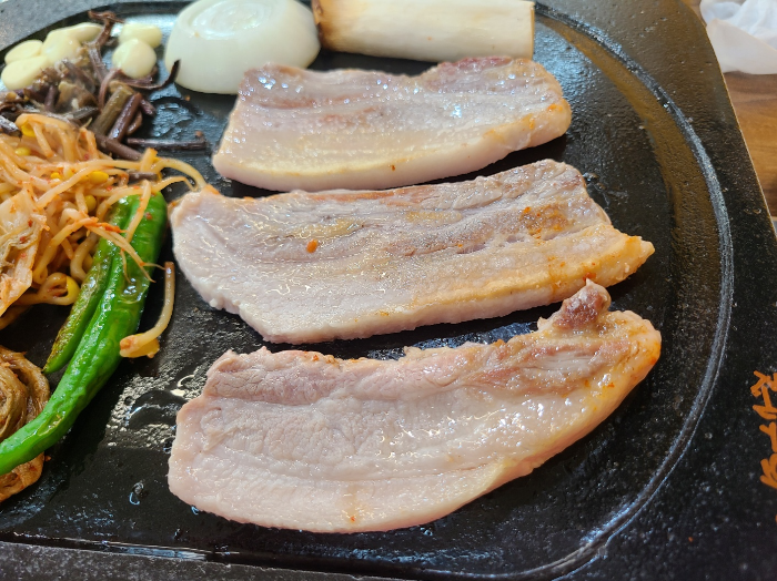 오돌뼈가 살짝 있는 부분의 삼겹살~ 조금 더 많이 있었더라면 더 맛있는 부위였겠지만, 그래도 갈빗대 근처에 있었던 삼겹살처럼 생겼다. 돌판이 달궈지면 살살 기름기가 나오는 게 보인다. 두근두근~! 기름을 눈으로 보고 소리까지 들으면 '아! 이제 곧 먹을 수 있겠구나' 하는 희망이 생긴다.