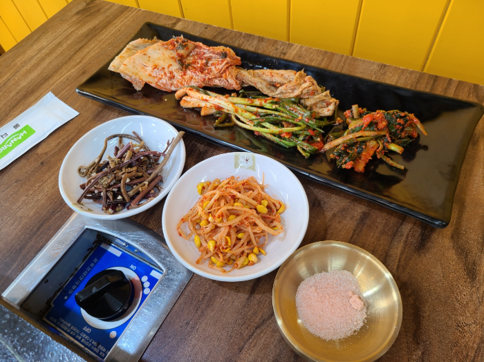 엄마가 직접 담그신 김치가 나왔다. 나오자마자 구워먹으면 맛있겠다고 생각되는 비주얼이다. 파김치랑 갓김치도 직접 담그신 것 같았다. 맛이 아주 알싸하니 좋았다. 파김치는 내 소울반찬 중에 하나다. 고사리랑 콩나물도 돌판이면 구워 먹어야겠지?