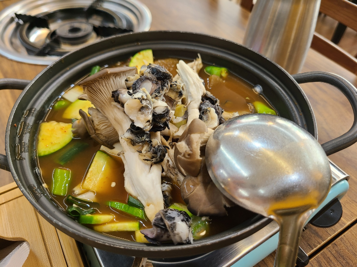 삼겹살 굽고 있는데 찌개가 나왔다...? 이게 그냥 나와? 버섯이랑 올갱이, 꽃게가 들어 있는 된장 찌개였다. 애호박이랑 야채도 많이 들어있고 국물이 시원했다. 차만 없었으면 맥주 한잔에 캬 하면 딱 좋을 그런 국물이었다. 일단 찌개가 슴슴해서 좋다. 너무 된장 맛이 강하거나 간이 진하면 고기 맛을 느끼기 어려울 때도 있기 때문이다.