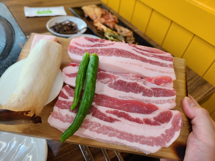 때깔이 아주 좋았던 삼겹살!👍 꽈리고추랑 버섯, 양파가 함께 나온다. 삼겹살은 지방이 적당히 섞인 부분이라서 내 기준에 좋다고 느꼈다. 두께도 적당히 두툼했고 빛깔도 괜찮았다. 돼지 기름에 김치 구울 생각하니까 콧구멍 벌렁벌렁하죠?