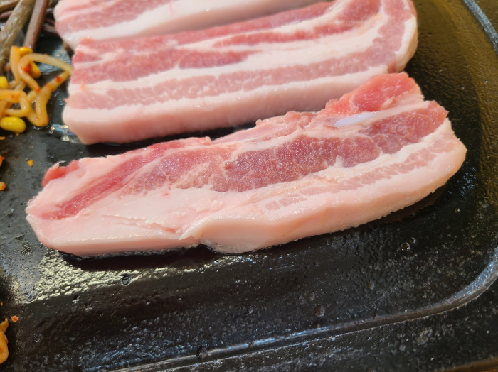 오돌뼈가 살짝 있는 부분의 삼겹살~ 조금 더 많이 있었더라면 더 맛있는 부위였겠지만, 그래도 갈빗대 근처에 있었던 삼겹살처럼 생겼다. 돌판이 달궈지면 살살 기름기가 나오는 게 보인다. 두근두근~! 기름을 눈으로 보고 소리까지 들으면 '아! 이제 곧 먹을 수 있겠구나' 하는 희망이 생긴다.
