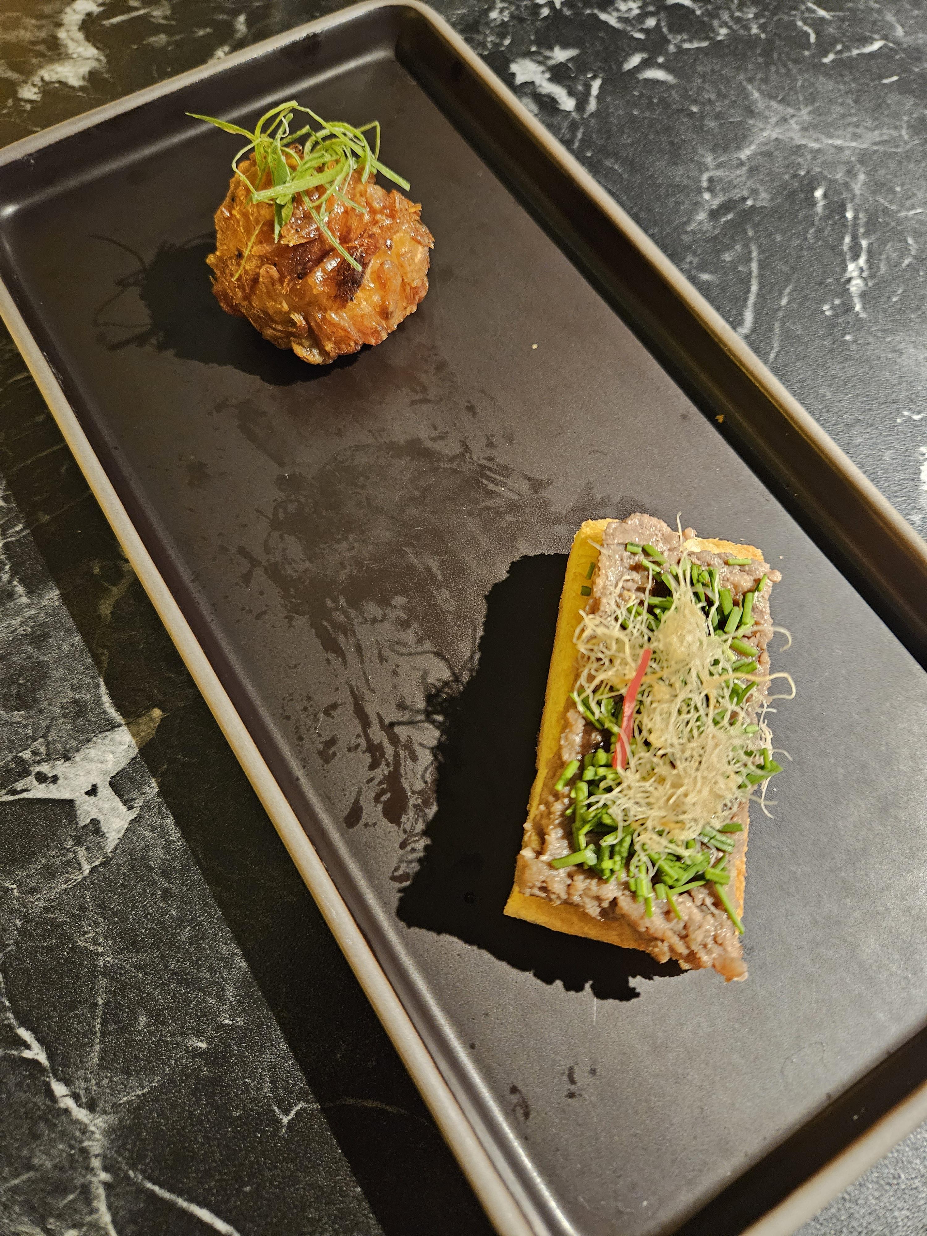 순서대로 음식이 나왔다. 떡갈비 샌드와 새우강정! 맛이 강하지 않아서 술과 곁들여 먹기 딱 좋았다. 맛이 강하지 않다고 표현했지만 그럼에도 재료가 가지고 있는 맛은 훌륭히 잘 내기 때문에 좋다.