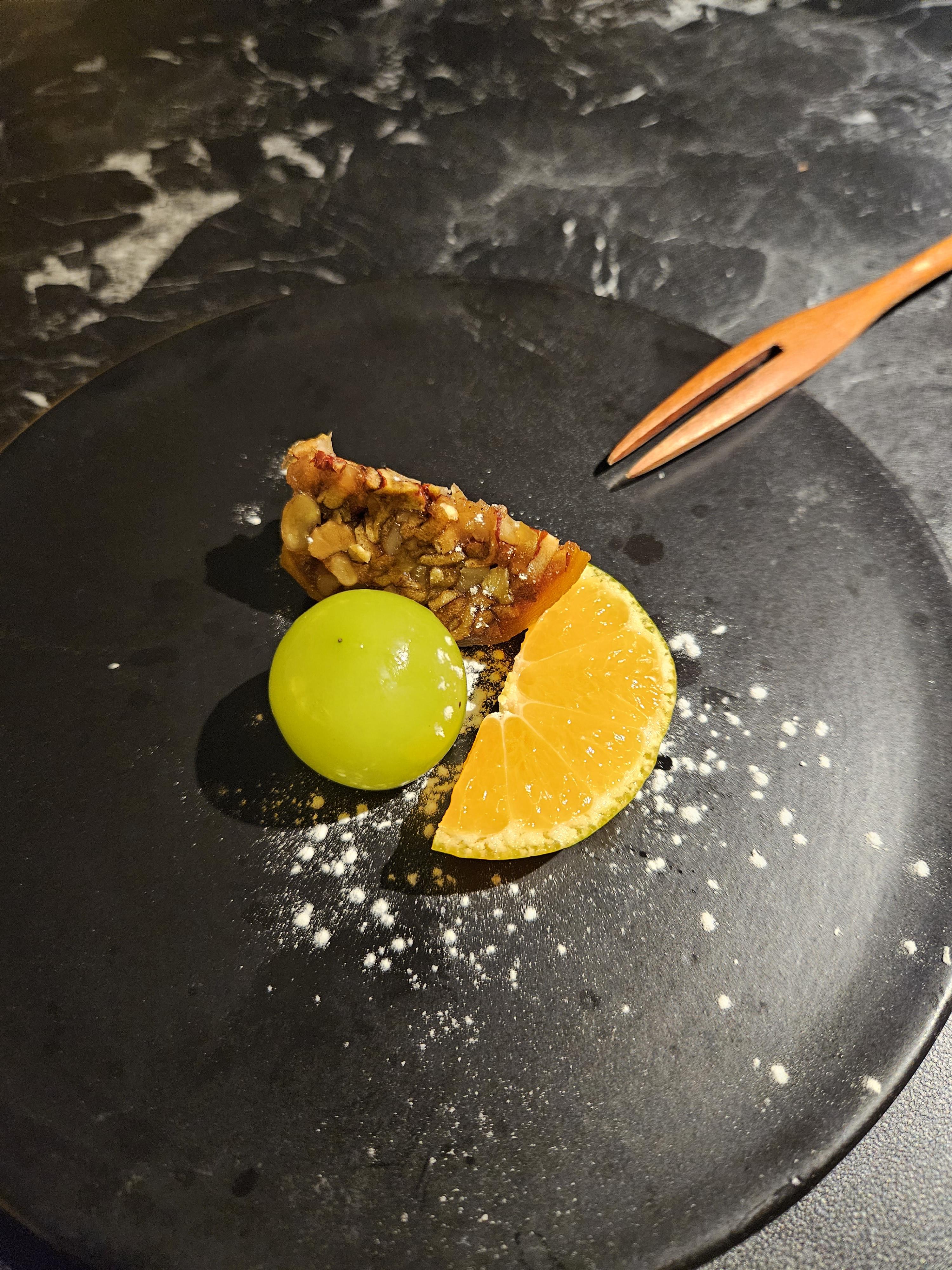 리필하고 싶었던 메뉴. 전복쌈채. 맛이 특이하면서 전복 특유의 식감이 좋았다. 소스가 감칠맛 나는 것이 아주 마음에 들었다. 얘도 샴페인이랑 진짜 잘 어울렸는데 여기서 느꼈다. 아! 여기는 술이랑 같이 먹기 좋은 코스 요리 집인 것 같다! 라고! ㅎㅎㅎ 분위기도 좋고 음식 맛도 너무 좋았기 때문이다.
