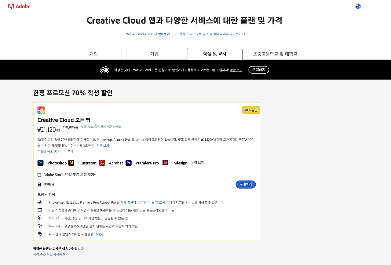 학생 및 교사를 위한 특별 할인은 정말 큰 혜택이에요. 크리에이티브 클라우드의 모든 앱을 70% 할인된 가격으로 이용할 수 있으니, 디자인이나 영상 편집을 배우고 있는 학생들에게는 더할 나위 없는 기회죠!